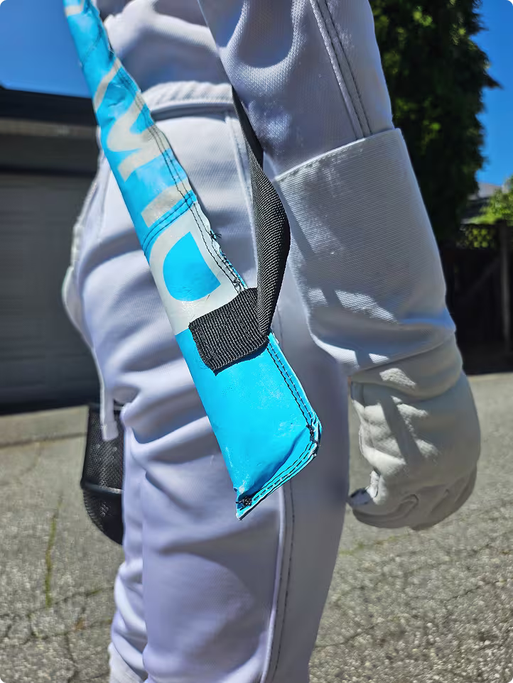 - Chain the handles into a cross-body strap and secure the sword with straps.